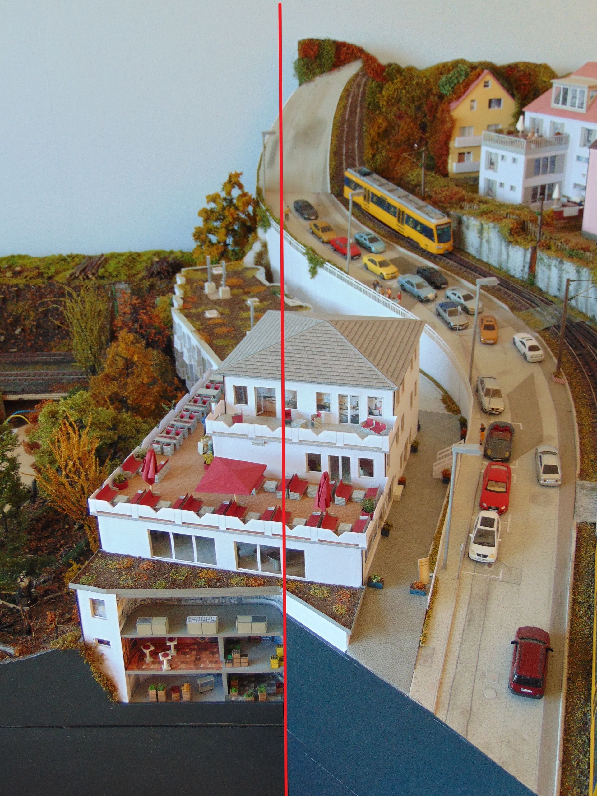 Der fertige Übergang vom Modul 4 zum Modul 3. Die rote Linie zeigt die Modulkante. Hier habe ich die Häuser und die Straße noch auf das Modul 3 (rechts) gebaut. Den kleinen Wald und die Böschung vom Modul 4 (lins) werden darunter geschoben. Man muss schon sehr genau schauen, um die Übergänge zu sehen.