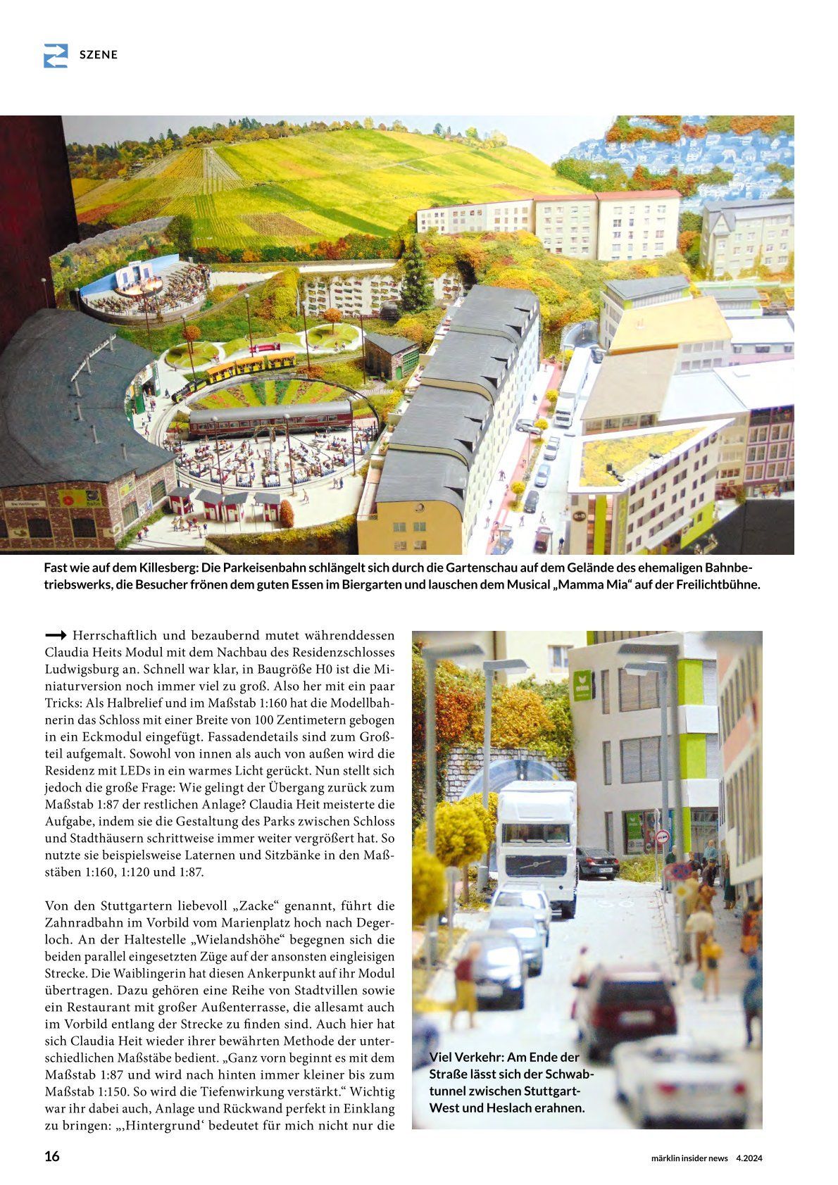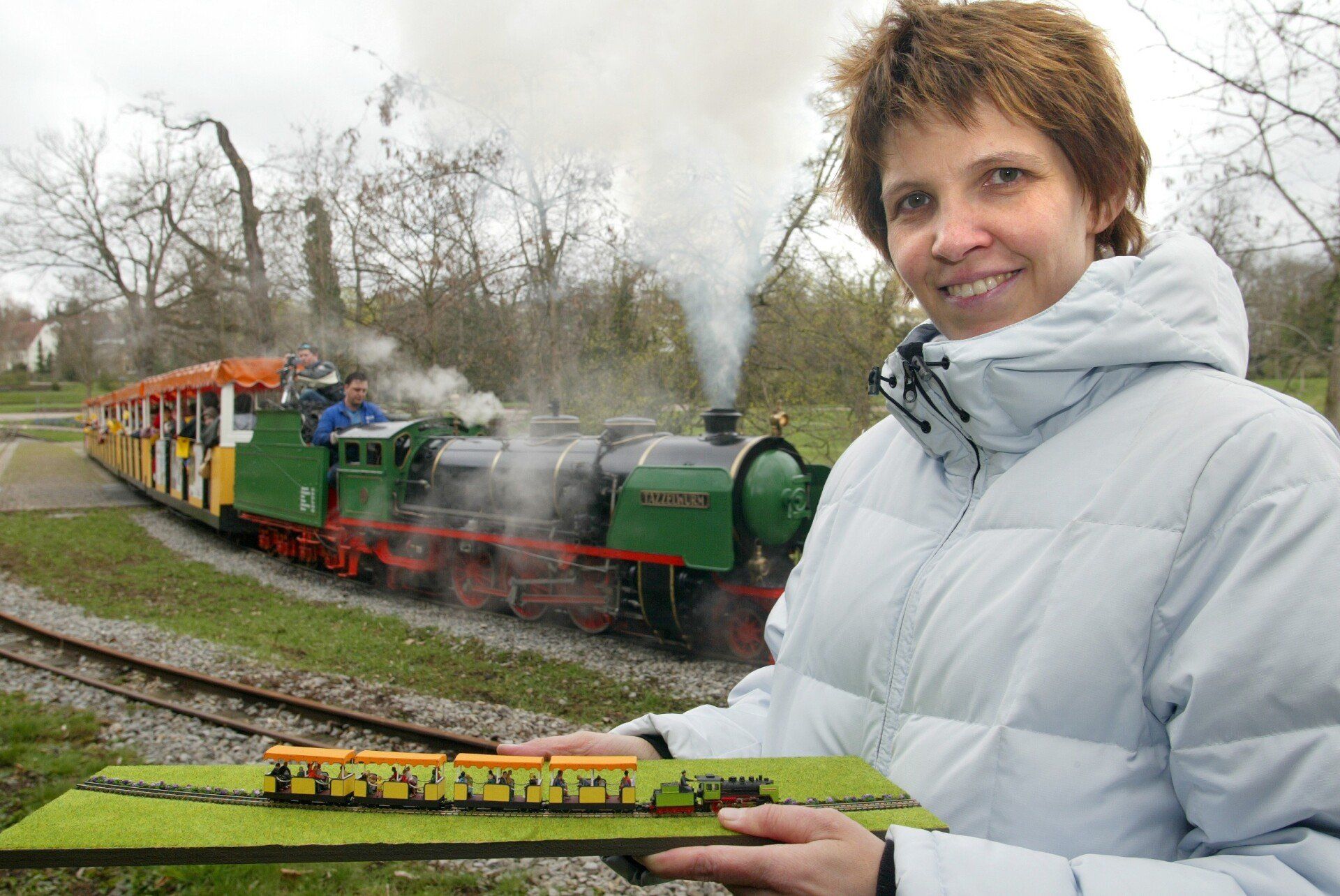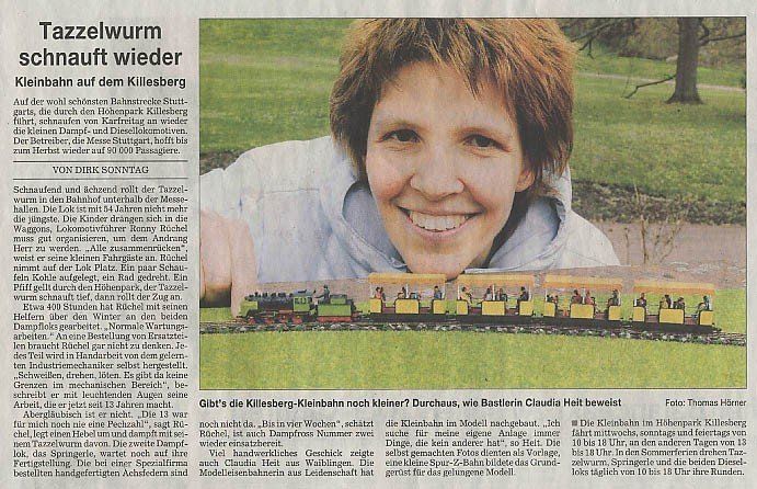 Den 4 april 2004 blev jag inbjuden till säsongsöppningen av Killesbergbanan i Stuttgart tillsammans med min lilla parkbana. Lyckligtvis var det kallt den dagen men det regnade inte - vagnarna på min parkbana är gjorda av papper och skulle ha lösts upp i regnet... Modellen var särskilt beundrad av "Vänner & sponsorer av Killesbergbana e.V.". Till min förvåning var också reporter och fotografer från Stuttgarts tidning närvarande. Det var fantastiskt för mig hur lång tid det tar att skapa en bra bild - man brukar inte tänka på det! Nästa dag kom en artikel med en bild i Stuttgarts tidning och till min förvåning var inte bara Killesbergbahn på bilden där utan jag också! Man kan föreställa sig att min telefon inte ringde bara en gång den dagen...